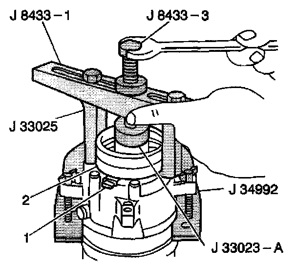 10. Tighten the J 8433-3 against the J 33023-A in order to remove the clutch coil (2).