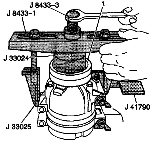 7. Install the J 8433 onto the compressor clutch coil (1) and tighten the puller leg bolts.