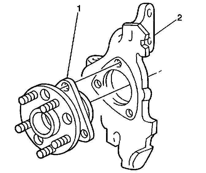 6. Remove the hub and bearing assembly (1) from the steering knuckle (2).