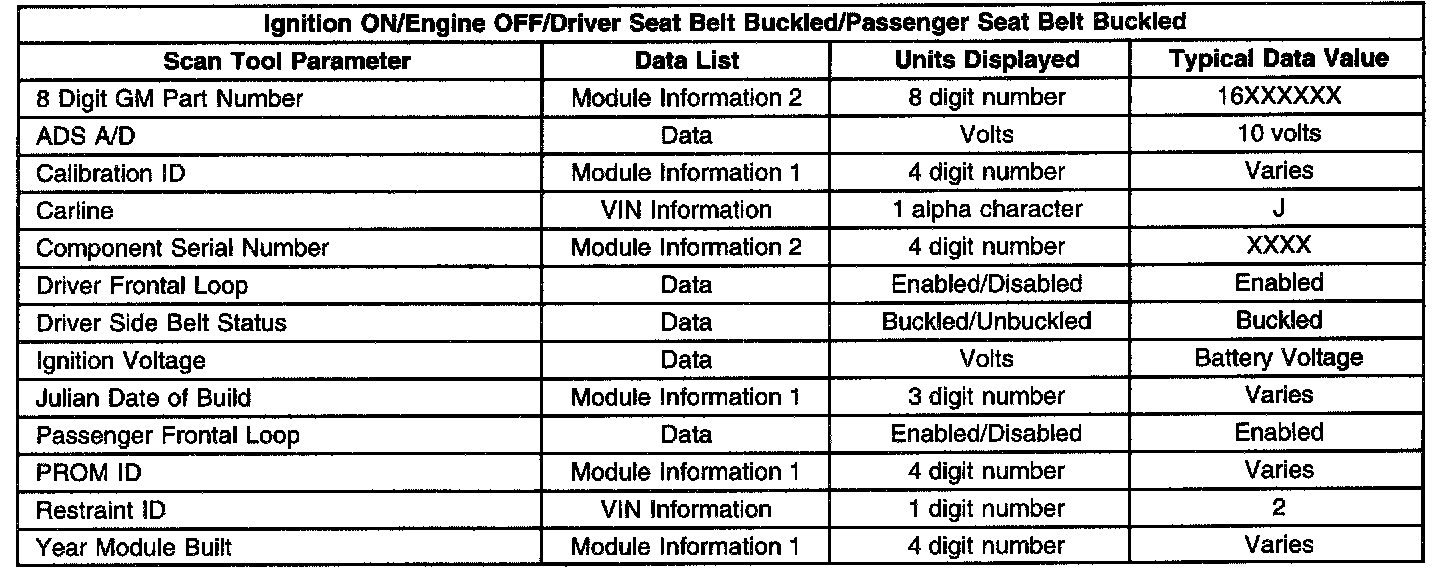 The SIR Scan Tool Data List contains all the restraint system related parameters that are available on the scan tool. The parameters in the list are arranged in alphabetical order. The column, "Data List," indicates the location of the parameter within the scan tool menu selections.
