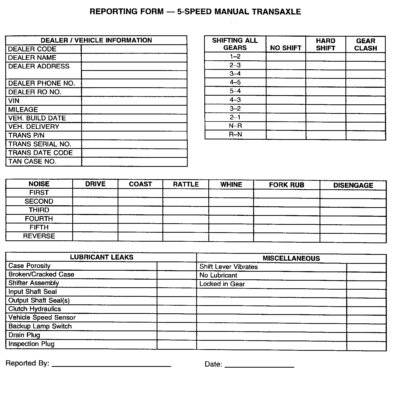 This chart is intended as a tool to investigate concerns on transaxles. Below are listed some common causes for concerns on transaxle concerns which are not transaxle related. The concern may also be generated by a condition within the transaxle. For additional information concerning the transaxle, contact the Technical Assistance Center Before calling, be sure to have all the necessary information available per the attached "Reporting Form" in order to help further diagnose your concern.