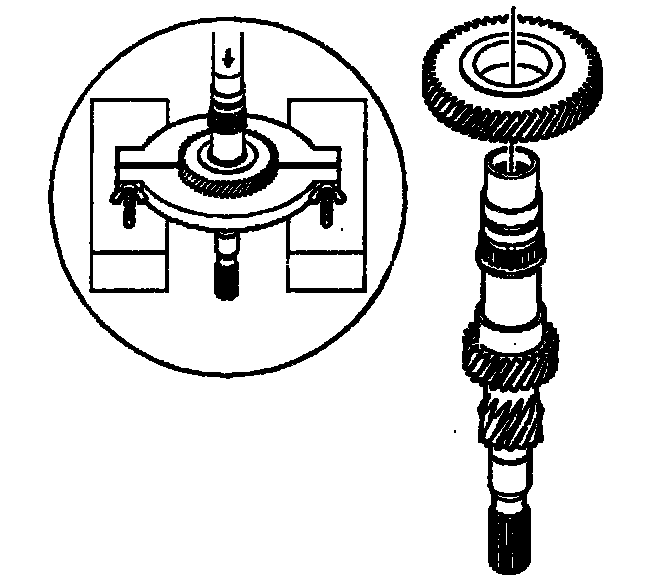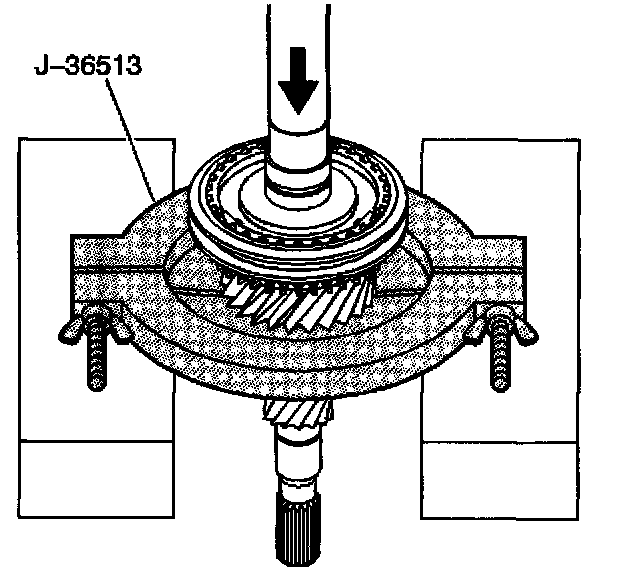 5. Remove the bearing collar and the 3rd/4th synchronizer from the input shaft using the J 36513, under the 3rd speed gear, the 3rd gear, and a hydraulic press.