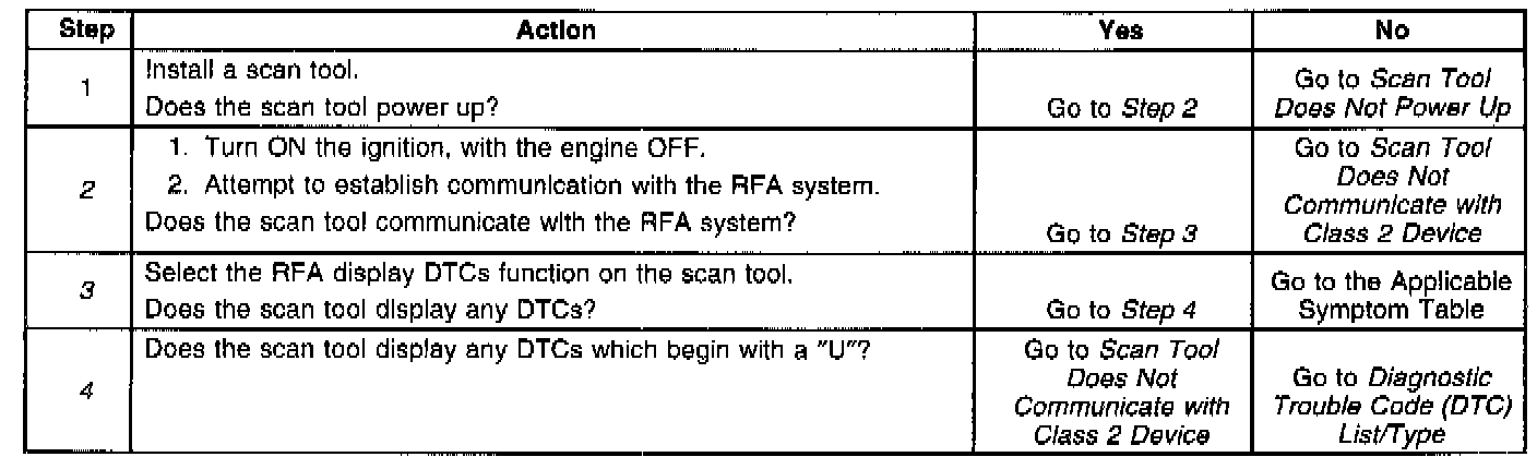 2. Tests if the RFA system is able to communicate. Lack of communication may be due to a partial malfunction of the class 2 serial data circuit or due to a total malfunction of the class 2 serial data circuit. The specified procedure will determine the particular condition.