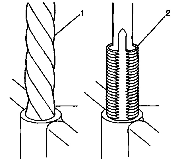 5. Using a tap wrench (2), tap the threads of the drilled hole.
