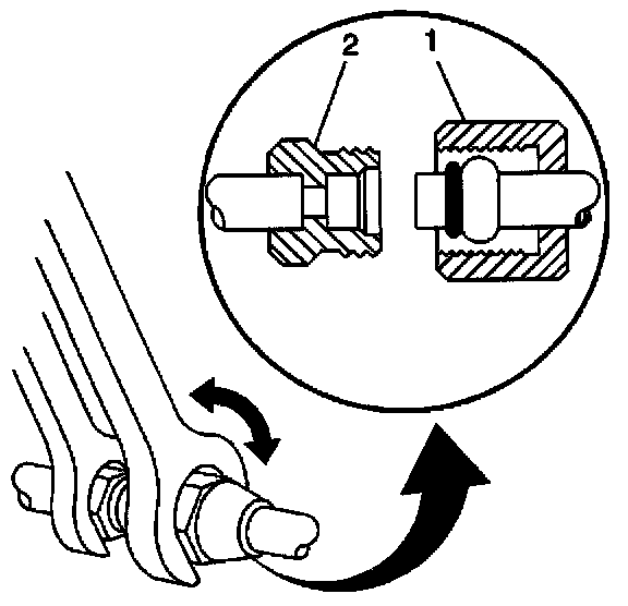 4. Using a back-up wrench on the condenser fitting (2), loosen the compressor hose fitting (1) from the condenser.