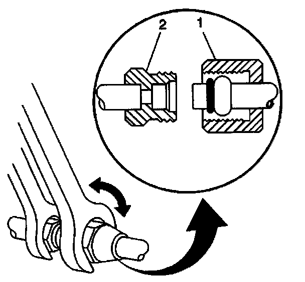 7. For compression-style fittings; use a back-up wrench on the A/C refrigerant component (smaller size) fitting (2), then tighten the A/C refrigerant hose (larger size) fitting (1) to specification.