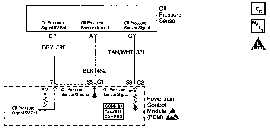 The EOP sensor changes resistance based on changes in engine oil pressure. The PCM sends the engine oil pressure sensor information to the Instrument Panel Cluster (IPC) via the class 2 circuit. When the EOP is out of range the Driver Information Center (DIC) displays a message.