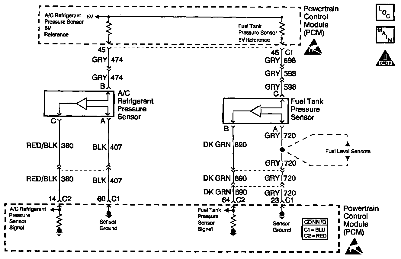 The PCM supplies a 5 volt reference, a signal circuit, and a ground circuit to the A/C refrigerant pressure sensor. As the A/C pressure increases or decreases, the resistance of the sensor changes and varies the amount of signal voltage detected by the PCM.