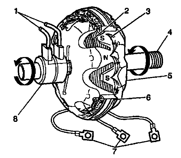 Current flows (1) through the slip rings (8) to the rotor winding (2) in order to create a magnetic field (3). The engine-driven rotor (4) is rotated by the engine within the stator (5). This rotation creates an alternating current (AC) voltage in the stator windings (6). The AC voltage goes to the rectifier bridge (7). The rectifier bridge converts this AC voltage to direct current (DC) voltage. The DC voltage is delivered from the generator's output terminal to the battery and the electrical systems through a fusible link (11). The regulator grounds circuit 225 (10) when the charging system voltage is abnormal. This information causes the PCM to send a class 2 message to the instrument panel cluster, which activates the Charging System Fault message on the driver information center.