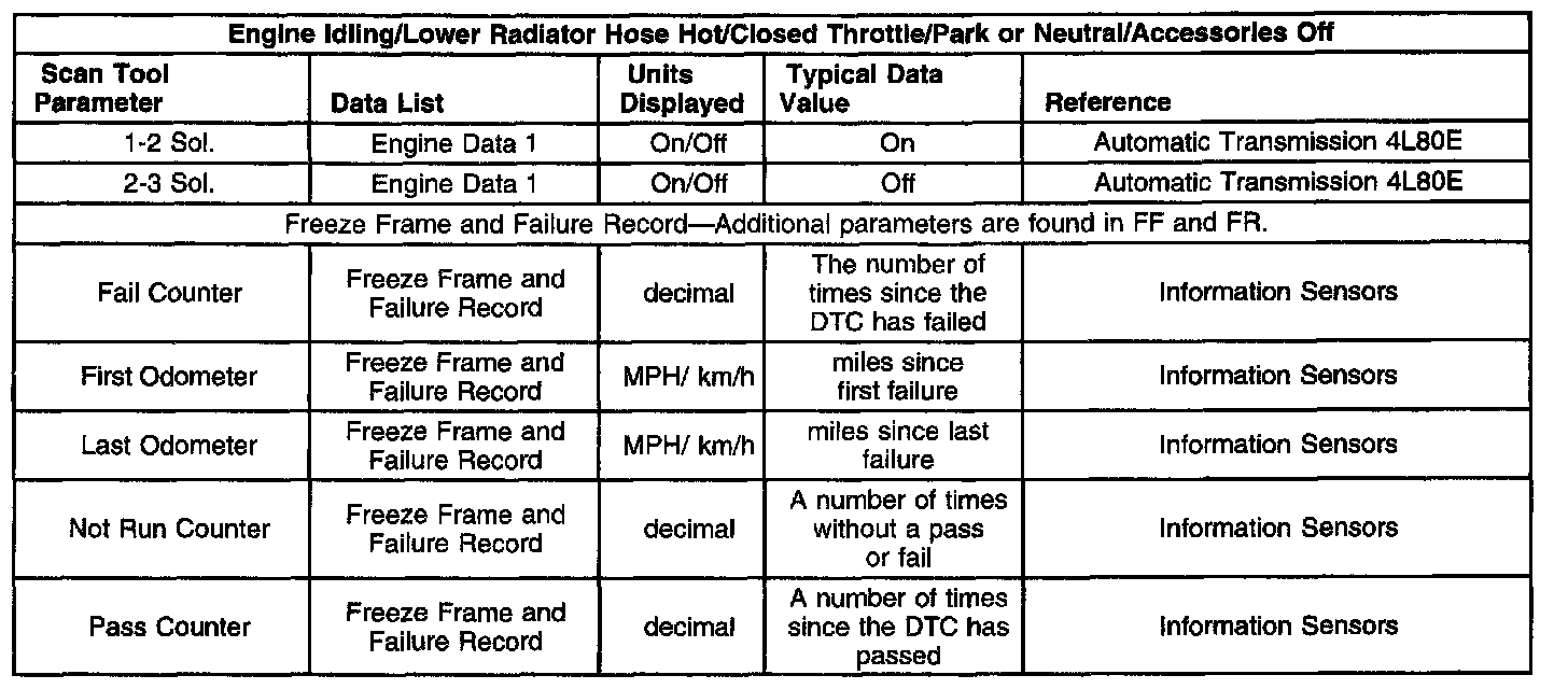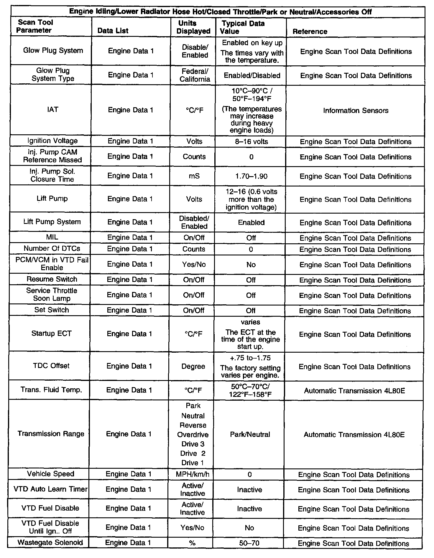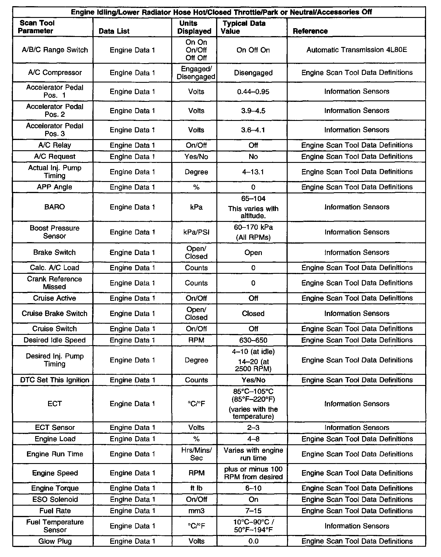 Use only the parameters listed in the tables for diagnosis. If a scan tool reads other parameters, the values are not recommended by General Motors for use in diagnosis. For more description on the values and the use of the scan tool diagnosis the PCM inputs, refer to the applicable diagnosis. If all values are within the range illustrated, refer to Symptoms. Symptom Related Diagnostic Procedures