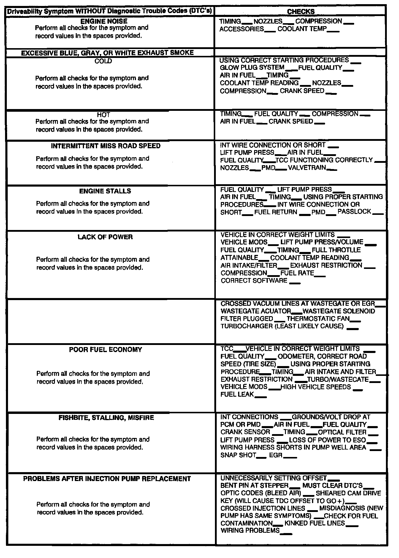2. Complete the entire Diesel EFI Diagnostic Worksheet by recording the values of the diagnostics performed (Attachment 1). Photocopy the Diagnostic Worksheet form and attach to the repair order hard copy. If core return is requested, the repair order and diagnostic sheet must be returned with the core.