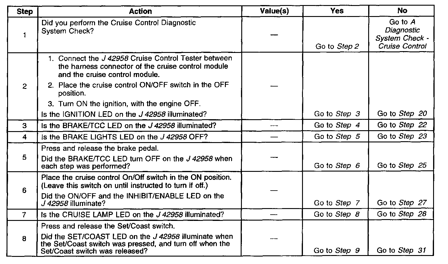 It has been found that when this Tester is used on some vehicles with high resistance or an open in the cruise control module ground circuit, the Tester's LED(s) will light abnormally. For example, the Brake/Clutch and VSS LED(s) will light normally but the Ignition LED will be dim with the ON/OFF switch in the OFF position. However, with the ON/OFF switch in the ON position only the VSS LED will light. If you come upon the above situation, please check the ground circuit prior to going on with your diagnosis.