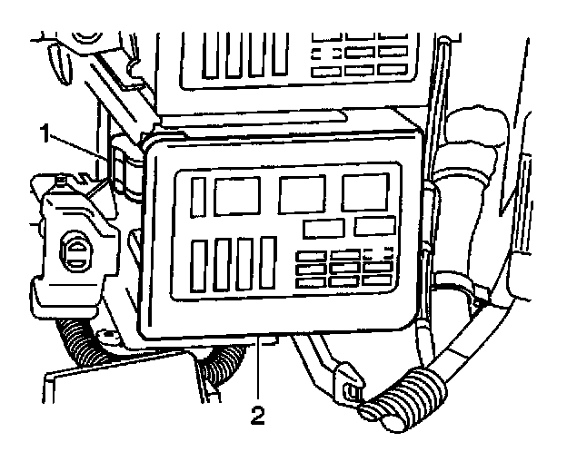 2. Release the retaining clip (1) and remove the engine wiring harness junction block (BOTTOM) cover (2).