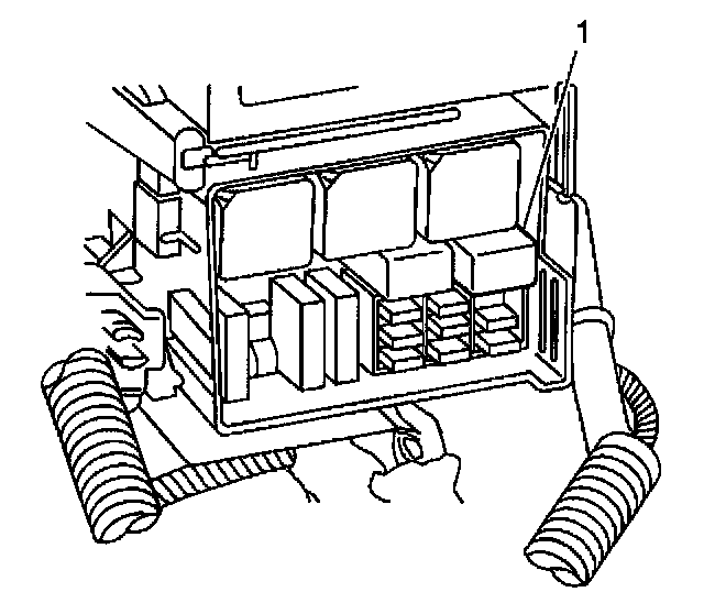 3. Remove the A/C compressor relay (A/C CMPR) (1) from the engine wiring harness junction block (BOTTOM).