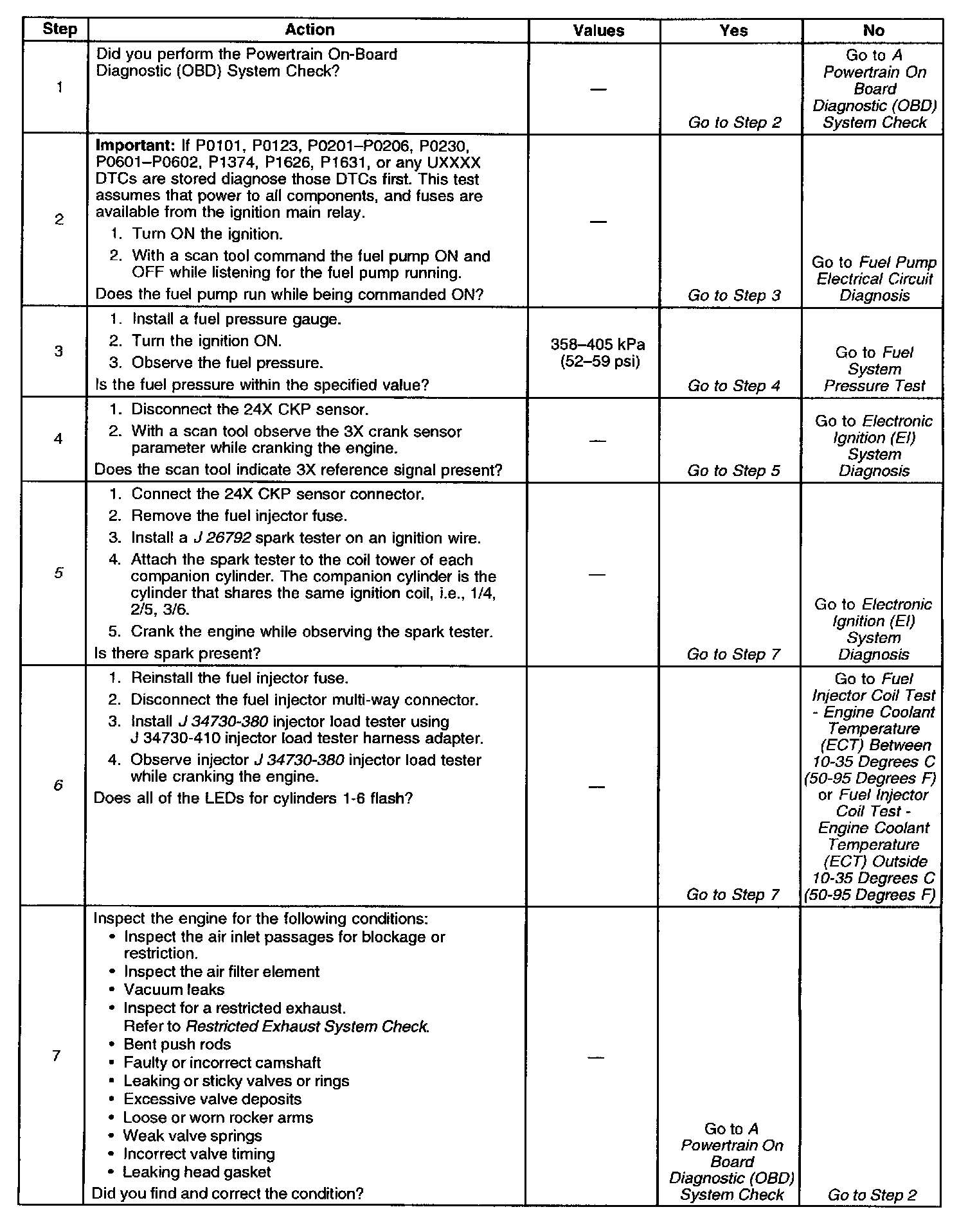 During cranking, the ignition control module monitors the 7X crankshaft position sensor input for recognition of the sync signal. The sync signal is used to determine the correct cylinder pair to spark first. After the sync signal has been processed by the ignition control module, it sends a 3X reference signal to the PCM. When the PCM receives this signal it will command all six injectors to open for one priming shot of fuel in all cylinders. After the priming, the injectors are left OFF for the next six 3X reference signals from the ignition control module, two crankshaft revolutions. This allows each cylinder to use the fuel from the priming shot. During this waiting period, a cam signal will have been received by the PCM. After the true camshaft position is detected, the PCM operates the injectors sequentially. However, if the cam signal is not present at start-up, DTC P0341 Camshaft Position (CMP) Sensor Performance will set and the PCM will start sequential fuel delivery in random pattern with a 1 in 6 chance that fuel delivery is correct.