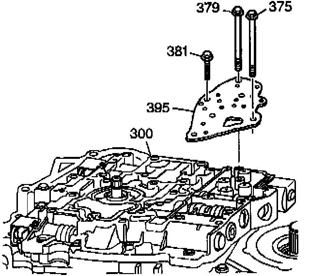 2. Install the control valve body bolts (375, 379, and 381) that mount the fluid pressure manual valve position switch to the control valve body (300).