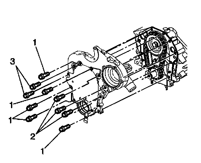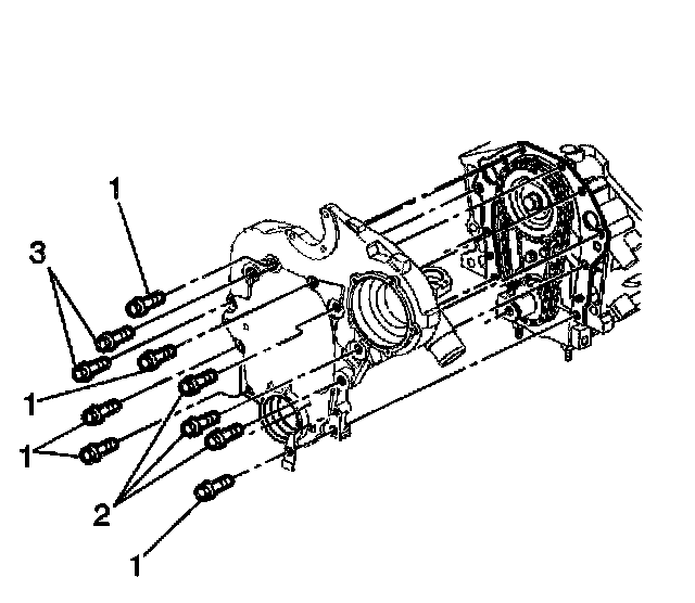 12. Remove the engine front cover bolts (1, 2 and 3).