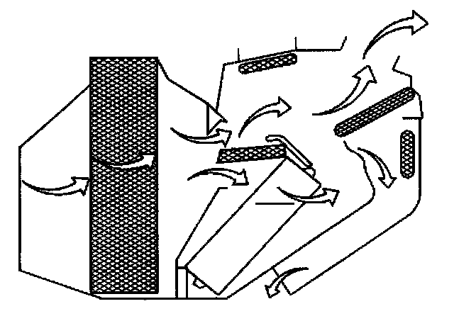Most of the air flows through the floor outlets. A small amount of air flows through the defroster duct and the side window defoggers.