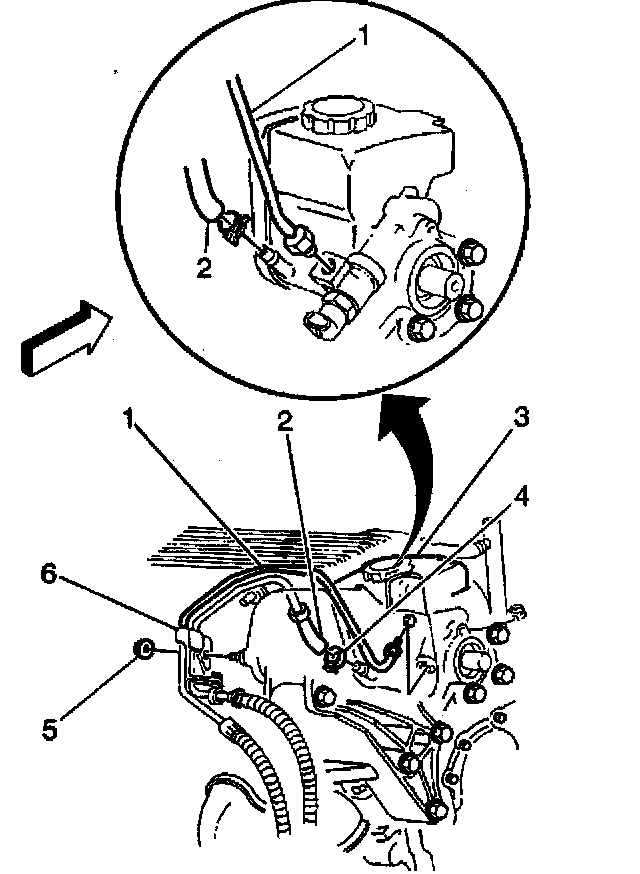 4. Remove the power steering return line from the power steering lines retainer (6).