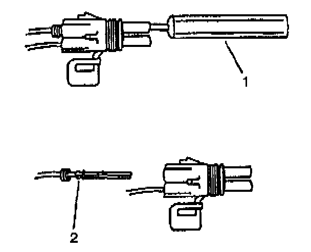 ^ Insert the Weather Pack(R) Terminal Removal tool into the front (mating end) of the connector cavity until it rests on the cavity shoulder (1).