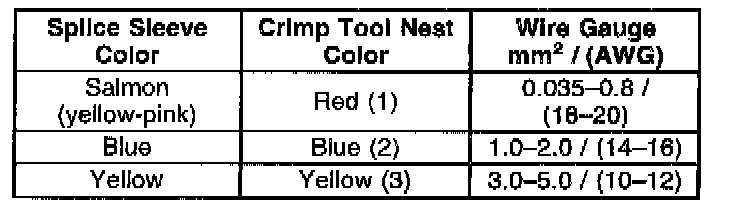 4. Select the proper sealed splice sleeve according to the wire size. Refer to the above table at the beginning of the repair procedure for the color coding of the splice sleeves and the crimp tool nests.