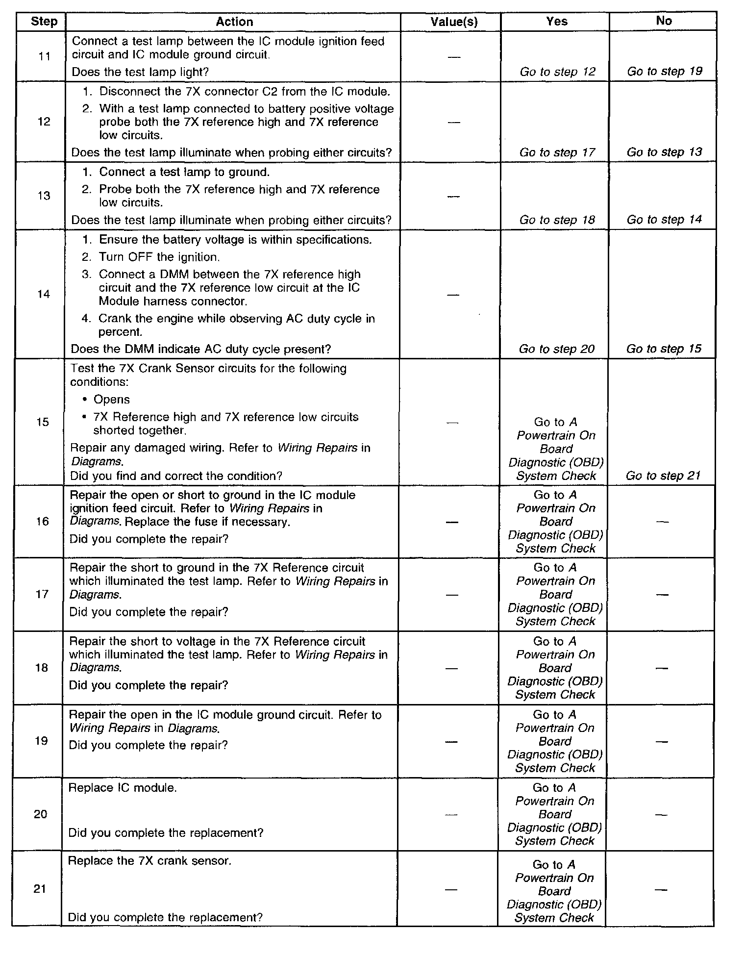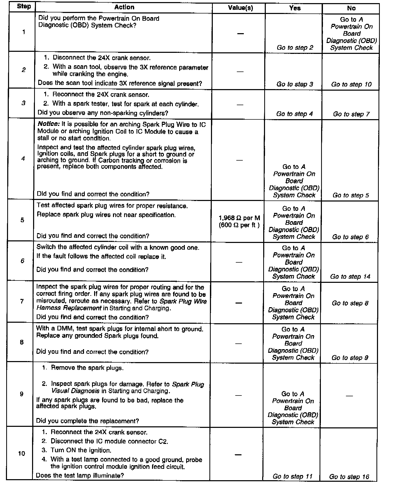 This table assumes there are no ignition system, fuel injector, cam sensor, or crank sensor DTC's present. The Electronic Ignition System Check tests for faulty ignition coils, spark plugs, plug wires, the 7X crank sensor, and IC module. This table requires the J 26792 Spark Tester.