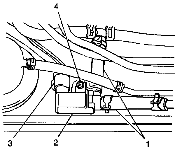 4. Remove the one screw (4) and the EVAP tank pressure control solenoid valve (2) from the fuel tank.