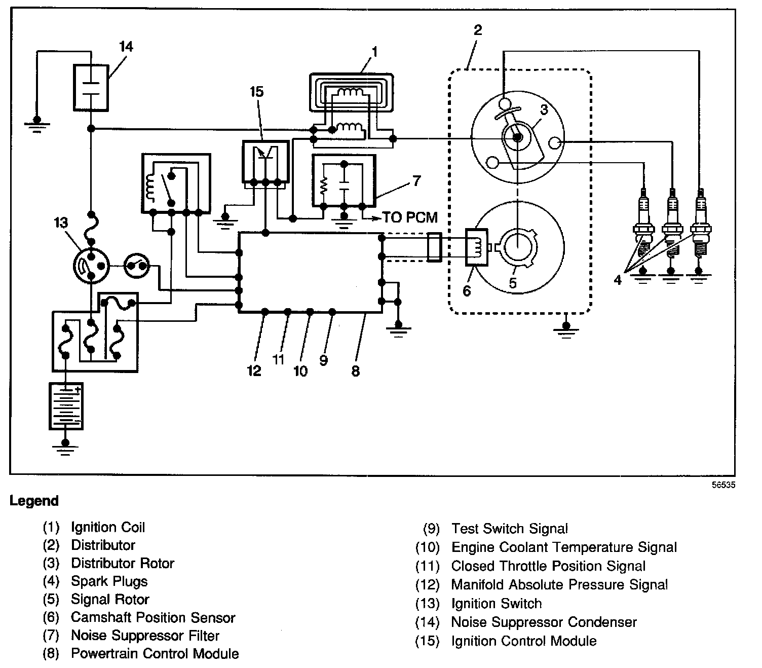 The PCM sends a signal to the ignition control module. The ignition control module is connected to the negative side of the ignition coil's primary circuit. When the signal from the PCM is interrupted, the field around the primary coil collapses and a high voltage is induced in the secondary coil. The high voltage induced in the secondary coil is then forced to find a ground through the secondary (coil) wire, the rotor, the distributor cap, the secondary (spark plug) wires and across the spark plug gap to the engine block. The following are the most important inputs for determining ignition timing requirements: