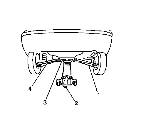 Important: The floor jack (2) pad must not be placed under the (rear suspension crossmember) (3) front reinforcement rib.