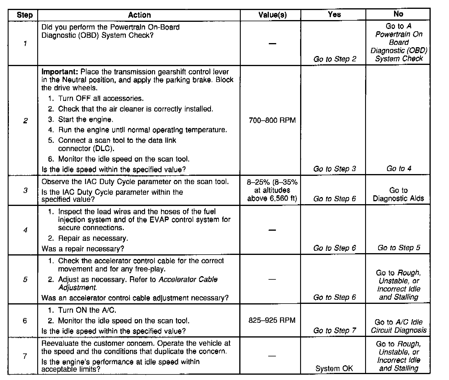If the engine idle speed is a concern when the air conditioning or the windshield defroster are running, check the A/C idle-up signal. Refer to A/C Idle Circuit Diagnosis. Component Tests and General Diagnostics