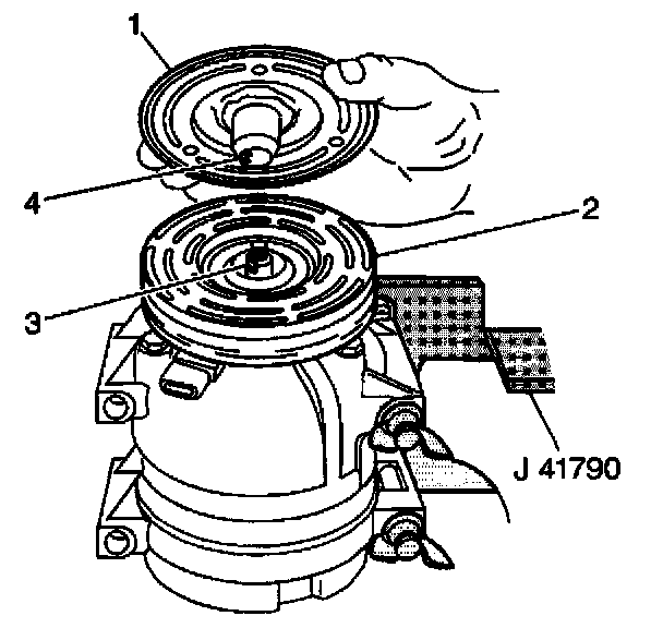 3. Align the shaft key with the shaft keyway in the clutch plate and the hub assembly and place onto the compressor shaft (3).