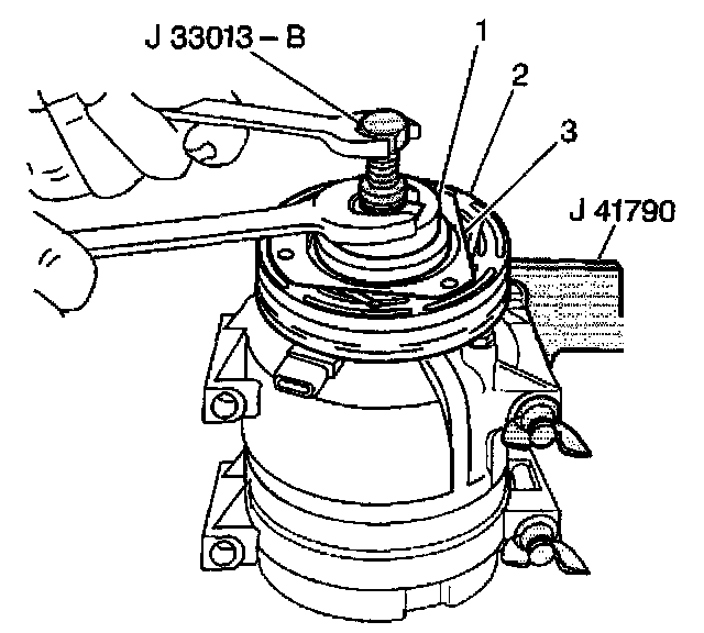 5. Install the J 33013-B and bearing tools (1) onto the clutch plate (3) and the hub assembly (2).