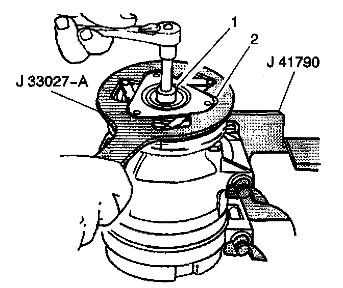 11. Hold the clutch plate and hub assembly (2) with the J 33027-A.