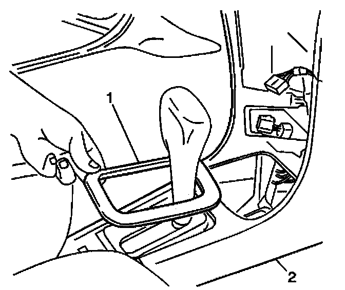 8. Remove the shifter trim plate (1) from the front floor console (2) (A/T only).