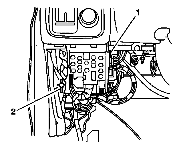 1. Install the multifunction alarm module (1) to the rear of Junction Block #2 (2).