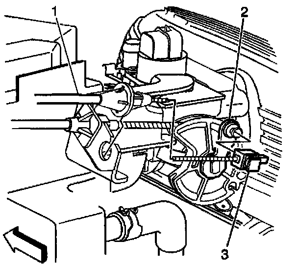 3. In order to release the tension on the cruise control adjuster, rotate the cam lever. Disconnect the cruise control cable adjuster (3) from the nail head on the throttle cam lever.
