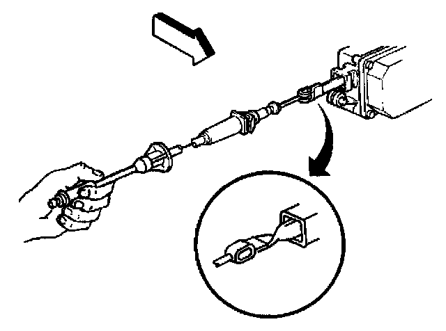 9. Pull the cable conduit toward the right side of the vehicle. Thread the cable through the slot in the round hole of the cable bracket.