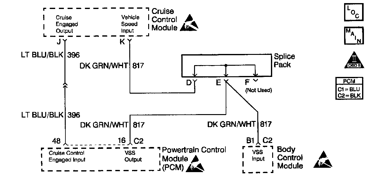 The stepper motor cruise module communicates with the Powertrain Control Module (PCM) over three circuits (cruise engaged, cruise disabled, and Vehicle Speed Sensor (VSS) output). The cruise enable status tells the PCM if the cruise control system is enabled. The VSS output is the speed signal from the vehicle speed sensor through the PCM and used by the cruise control module. The cruise disable line allows the PCM to disable cruise under the various conditions described below: