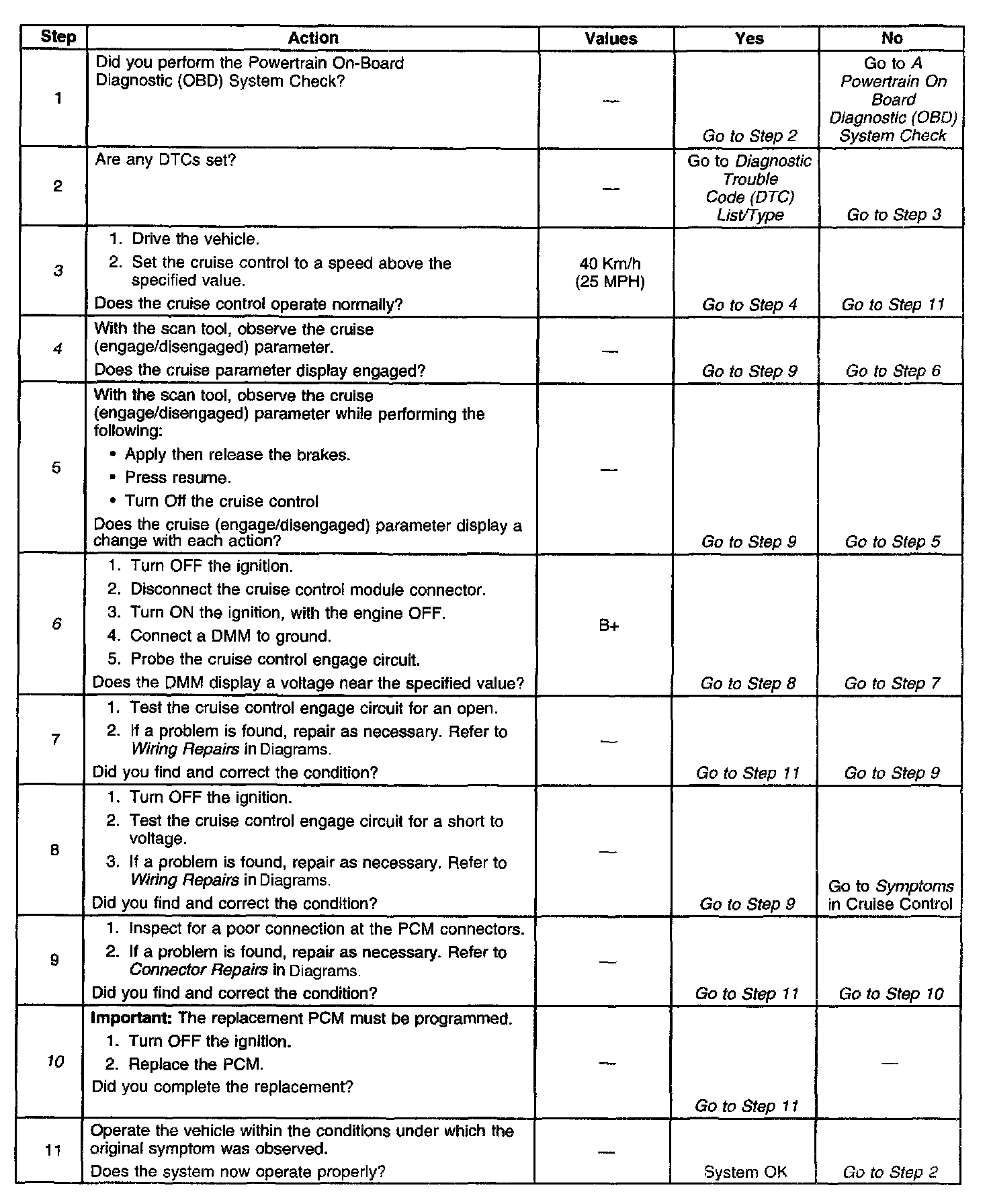 ^ This table will not diagnose any cruise control system circuits other than those connected to the PCM. For diagnosis of the remaining circuits, refer to Wiring Repairs in Diagrams.