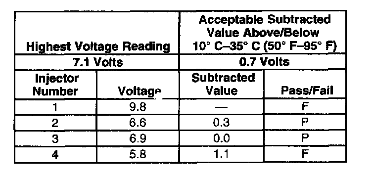 3. The first second of the voltage displayed by the DMM may be inaccurate due to the initial current surge, therefore, record the lowest voltage displayed by the DMM after the first second of the test. The voltage displayed by the DMM may increase throughout the test as the fuel injector windings warm and the resistance of the fuel injector windings changes. An erratic voltage reading (large fluctuations in voltage that do not stabilize) indicates an intermittent connection within the fuel injector. From the voltages recorded, identify the highest voltage, excluding any voltages above 9.5 volts. Subtract each voltage that is not above 9.5 volts from the highest voltage. Record each subtracted value (refer to the Example). The subtracted value for any fuel injector must not exceed 0.7 volt. A fuel injector with a subtracted value that is greater than 0.7 volt is considered faulty and must be replaced. A fuel injector with a recorded voltage above 9.5 volts is also considered faulty and must be replaced.