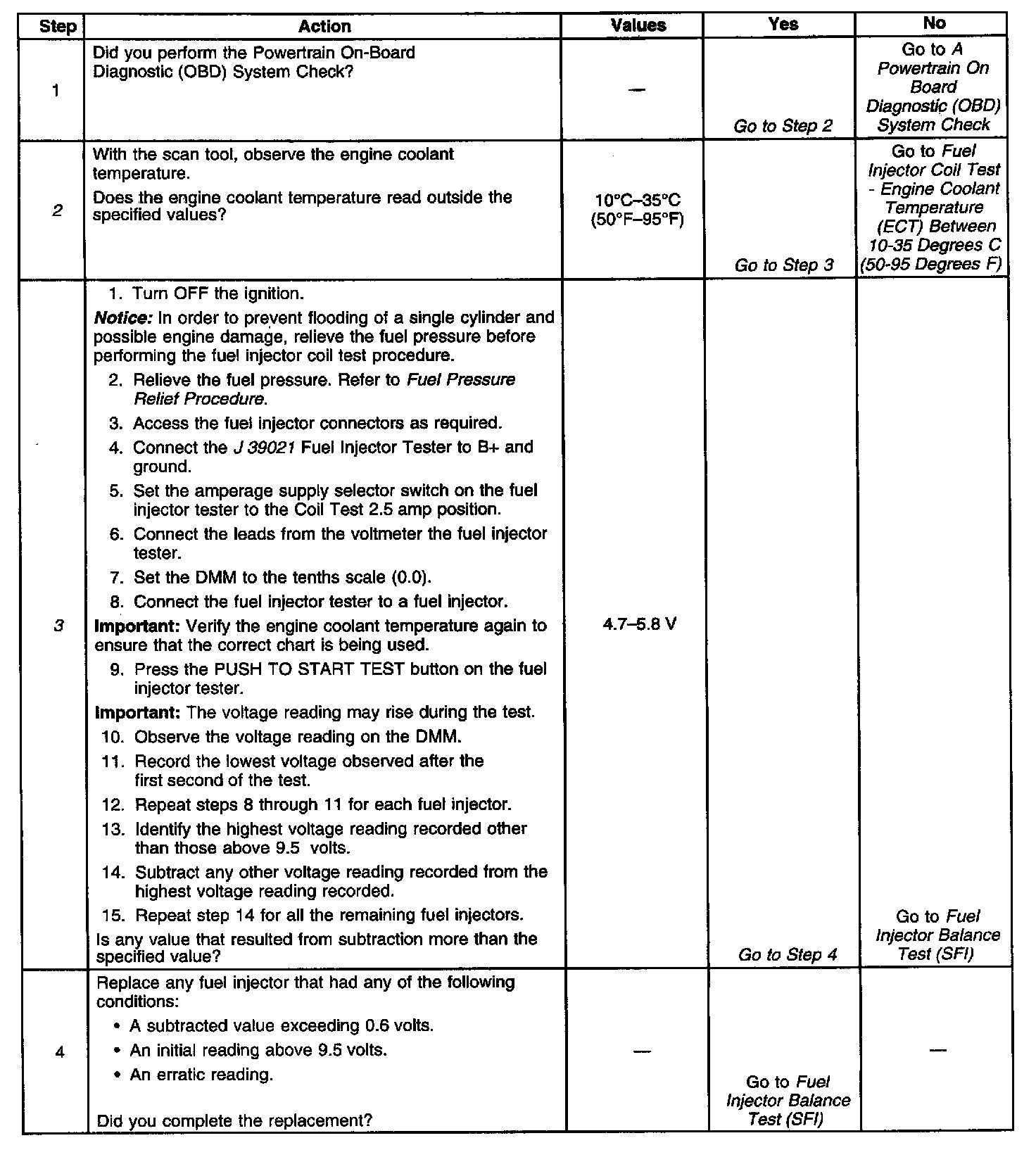 2. The engine coolant temperature affects the ability of the fuel injector tester to detect a faulty fuel injector. If the engine coolant temperature is between 10°C-35°C (50°F-95°F), go to Fuel Injector Coil Test Procedure - Engine Coolant Temperature Within 10°C-35°C (50°F-95°F).