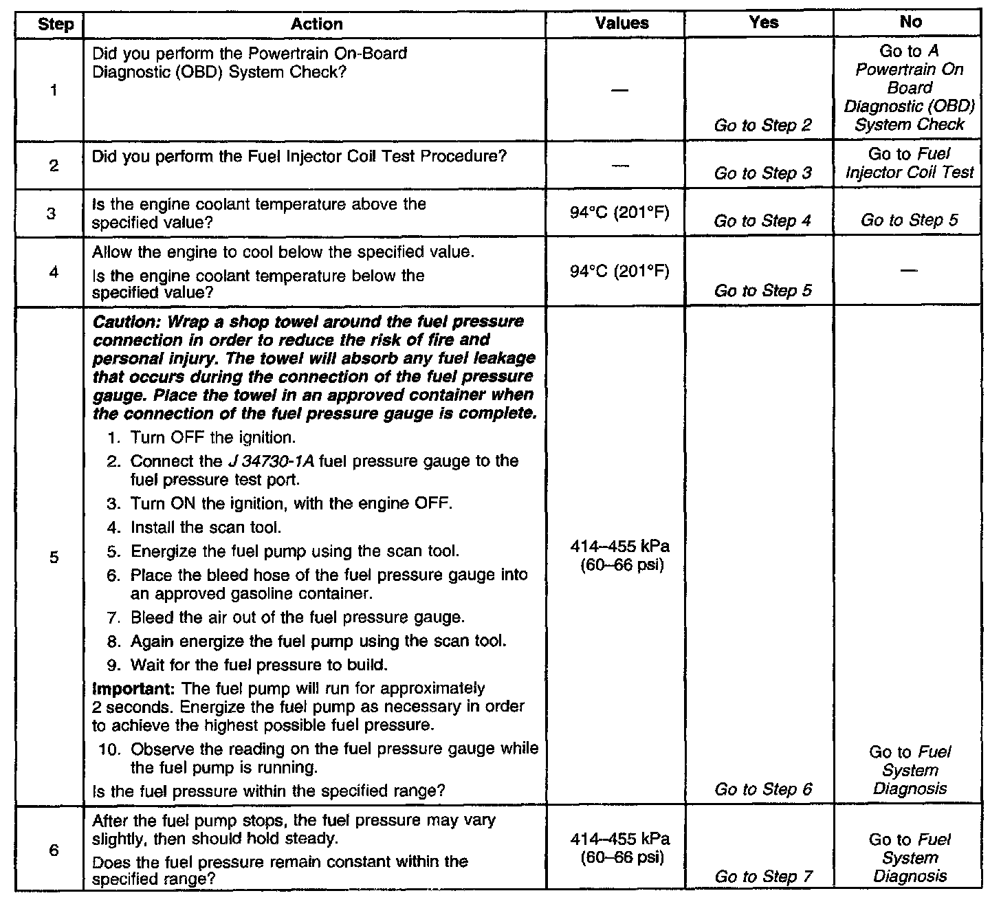 5. The fuel pressure should be within the specified range. If the fuel pressure is not within the specified range, refer to Fuel System Diagnosis. Component Tests and General Diagnostics
