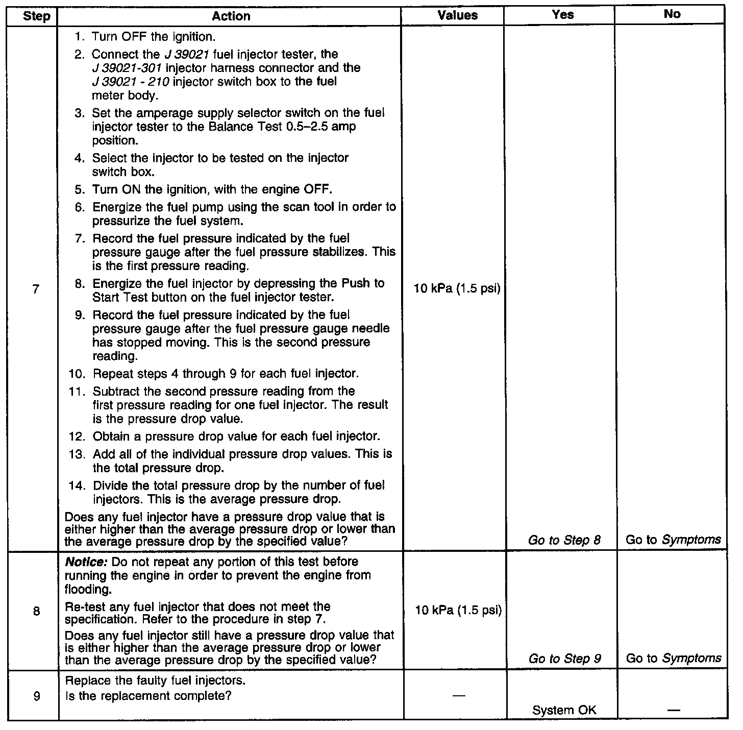 7. If the pressure drop value for each fuel injector is within 10 kPa (1.5 psi) of the average pressure drop value, the fuel injectors are flowing properly. Calculate the pressure drop value for each fuel injector by subtracting the second pressure reading from the first pressure reading.