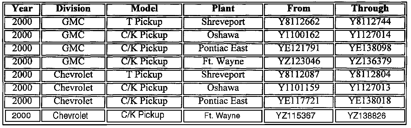 Involved are certain 2000 Chevrolet 2 and 4-wheel drive Silverado pickup trucks, GMC 2 and 4-wheel drive Sierra pickup trucks, Chevrolet 4-wheel drive extended-cab S-10 pickup trucks, and GMC 4-wheel drive extended-cab Sonoma pickup trucks equipped with 4 wheel disc brakes and built within the VIN breakpoints shown.