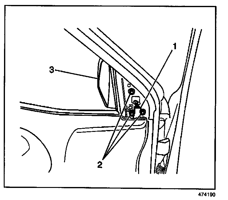 1. Install the outside rearview mirror (3) to the front side door. Secure the mirror with the 3 bolts.