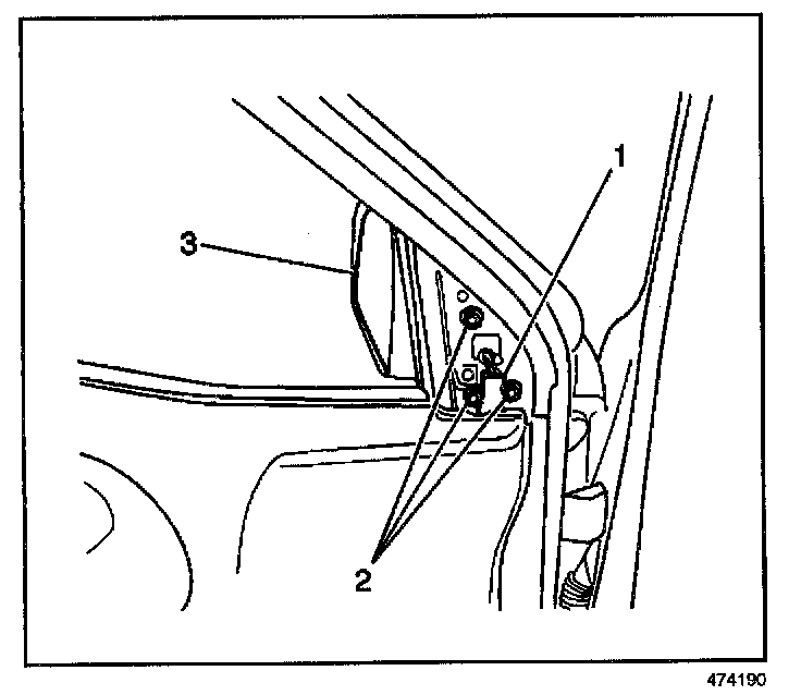 3. Remove the 3 bolts (2) and outside rearview mirror (3) from the door.
