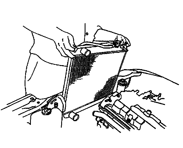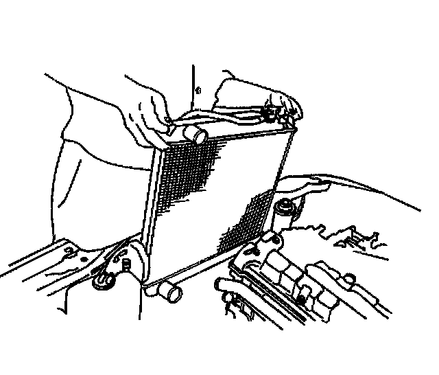 17. Lean the fan shroud toward the engine and lift the radiator up and out of the vehicle.