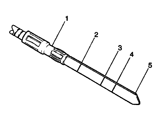 9.10. Remove the indicator and check the fluid level. The level should be between the FULL HOT (2) and the LOW HOT (3) marks. If the level is below the LOW HOT mark, add fluid to bring the level to the FULL HOT mark. Bringing the fluid level from the LOW HOT mark to the FULL HOT mark requires 0.3 liters (0.3 quarts) of fluid. Use Dexron III automatic transmission fluid GM P/N 12346143, or the equivalent.
