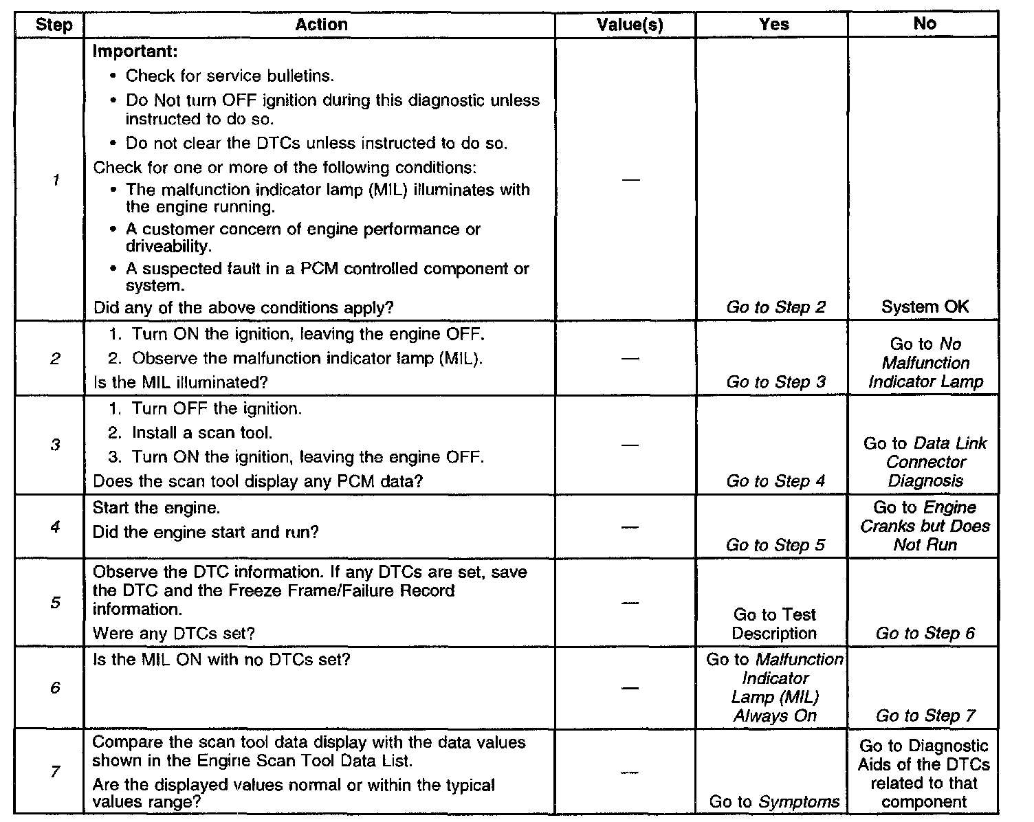 The Powertrain OBD System Check is an organized approach to identifying a problem created by an electronic engine control system malfunction. The Powertrain OBD System Check is the starting point for any driveability concern diagnosis because the system check directs the service technician to the next logical step in diagnosing the concern. Understanding and using the table correctly will reduce diagnostic time and prevent the replacement of good parts. Do not perform this check if a driveability concern is not present.