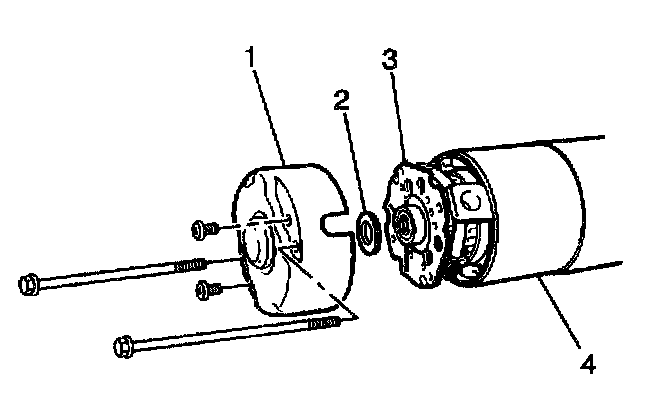 16. Install the spring washer (2) and the commutator end cover; secure with 2 bolts and 2 screws.